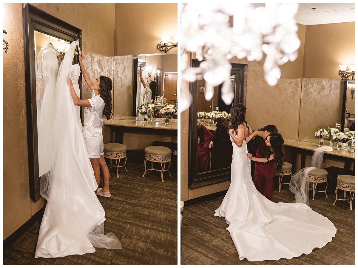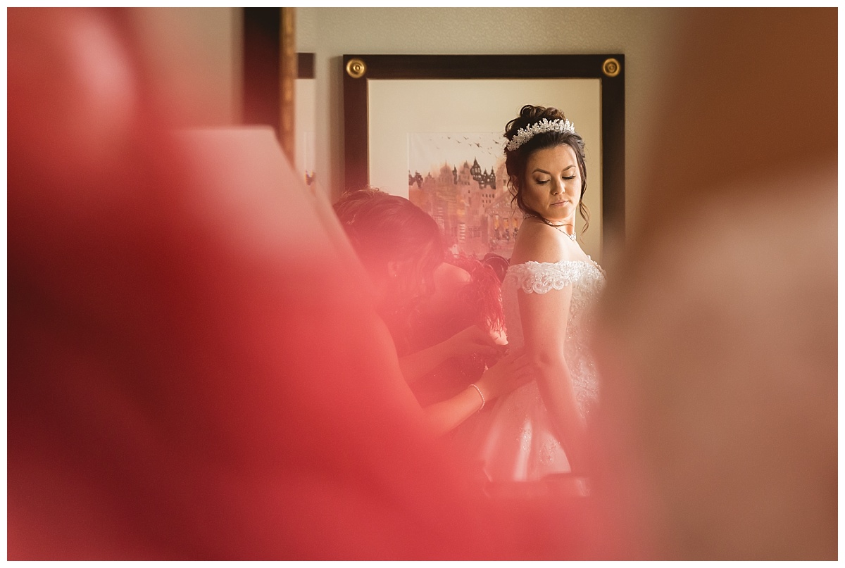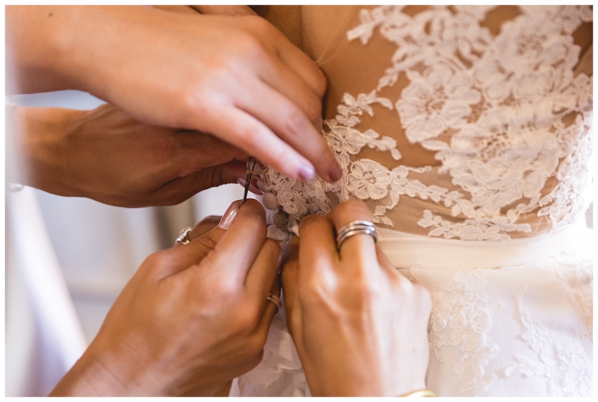 I absolutely adore photographing the “getting ready” part of the wedding day. It’s such a special and intimate time filled with love, laughter, and sometimes a few happy tears. Some of my favorite wedding photos from my big day (all the way back in 2005) were from my parent’s house, where I was getting ready with my family and bridesmaids. All the girls together, mom, grandma, and sometimes the future mother-in-law – it’s such a special time. I prefer to allow things to happen naturally while giving prompting as needed. Depending on your gown, brides should allow 30-45 minutes to get dressed. Don’t forget to relax and enjoy every moment!
